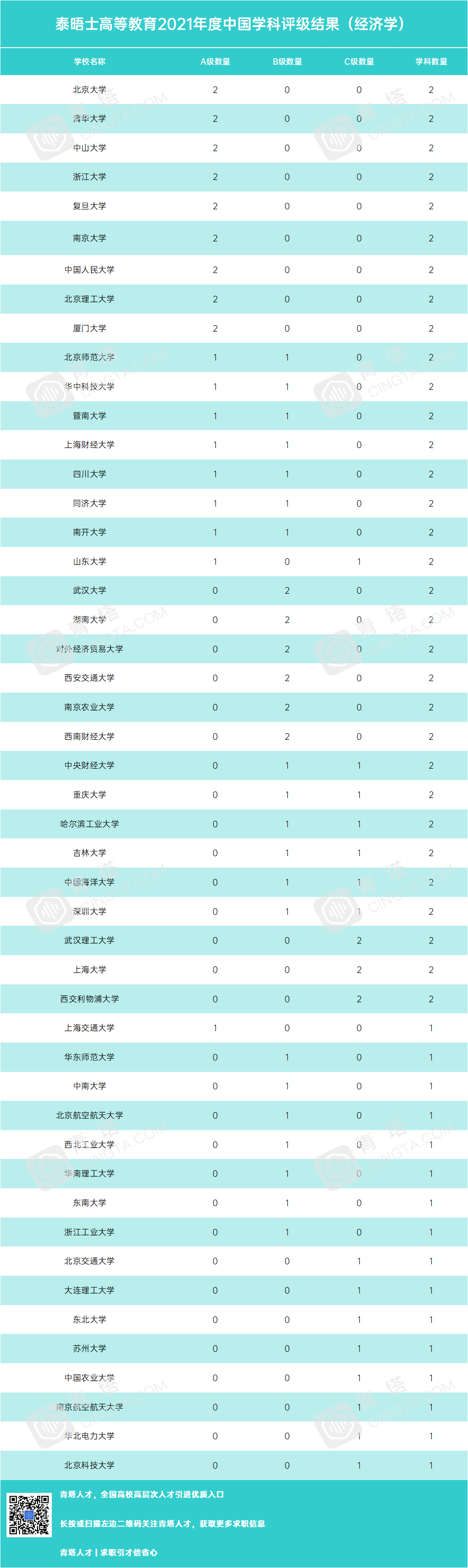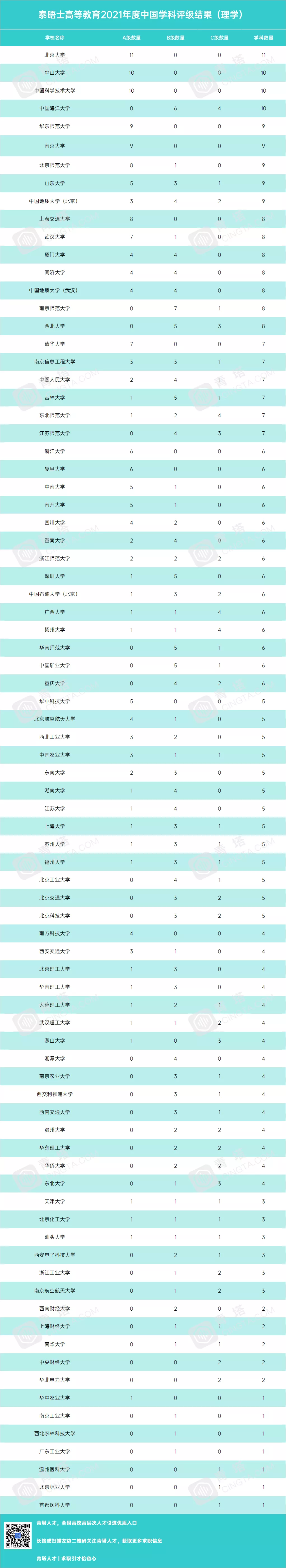 据统计,所有高校中,浙江大学A级学科数量最多,有51个,A级学科占比96.23%;清华大学次之,共有45个A级学科,且所有上榜学科均为A级学科。