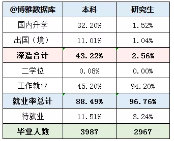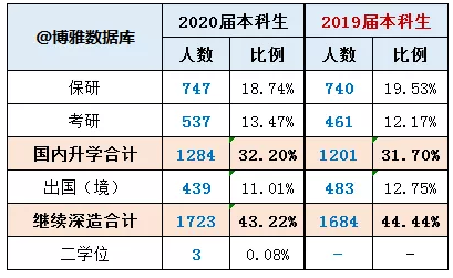 本科毕业生有 1723 人在海内外高校、院所继续 深造,占本科毕业生总数的 43.22%。