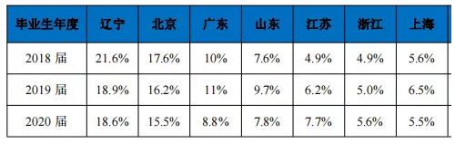 2020 届毕业生就业地区在国内 31 个省、自治区及直辖市均有分布。就 业流向较为集中的前十位地区分别为辽宁、北京、广东、山东、江苏、浙江、上 海、河北、陕西及湖北,占总体的 78.9%。