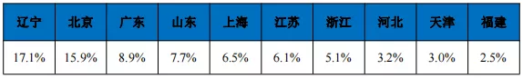 用人单位所属地域分布统计,排名前十位的地区分别是辽宁省、北京市、 广东省、山东省、上海市、江苏省、浙江省、河北省、天津市和福建省。