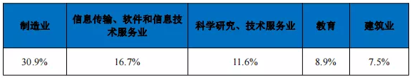 用人单位所属行业统计,排名前五位的分别为制造业、信息传输软件和信 息技术服务业、科学研究和技术服务业、教育和建筑业。