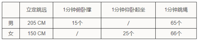 3.体质测试项目选择:男生为俯卧撑、跳绳、立定跳远三选一,女生为仰卧起坐、跳绳、立定跳远三选一。体测项目一旦选定,不得更改,选择项目测试不合格者无入选资格。合格标准如下: