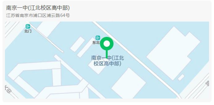 高德地图搜索“南京一中高中部江北校区”,腾讯地图或百度地图搜索“南京一中(江北校区高中部)”,请各位考生及家长务必仔细确定以上定位地址,避免弄错校区。