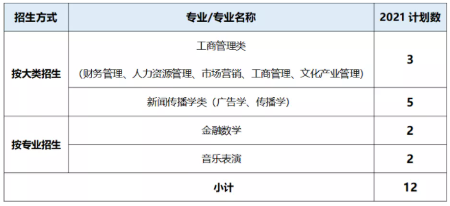 3、2021 年我校在上海设“院校专业组1”(不提科目要求)进行招生,包含专业/专业类如下:工商管理类(财务管理、人力资源管理、市场营销、工商管理、文化产业管理)、新闻传播学类 (传播学、广告学)、金融数学。