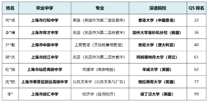 截止至2020年12月,我校2020届毕业生1341人,其中国内外深造人数965人,占比72%。QS全球前百名校录取人数718人,占比74.4%。参与就业的毕业生也深受跨国企业、国企、政府和公共组织等单位青睐。近年我校上海市毕业生前往美国加州大学洛杉矶分校、澳大利亚悉尼大学、英国华威大学、中国香港大学等高校继续深造。我校上海市毕业生去向(部分)见下表: