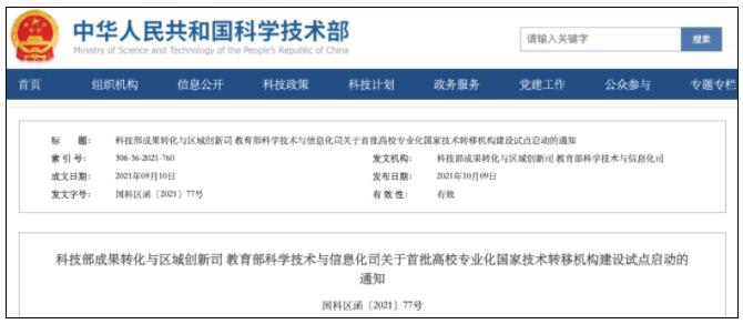 10月9日,科技部成果转化与区域创新司 、教育部科学技术与信息化司两部门联合发布《关于首批高校专业化国家技术转移机构建设试点启动的通知》,确定了首批20个高校专业化国家技术转移机构建设试点,试点期限为2年。