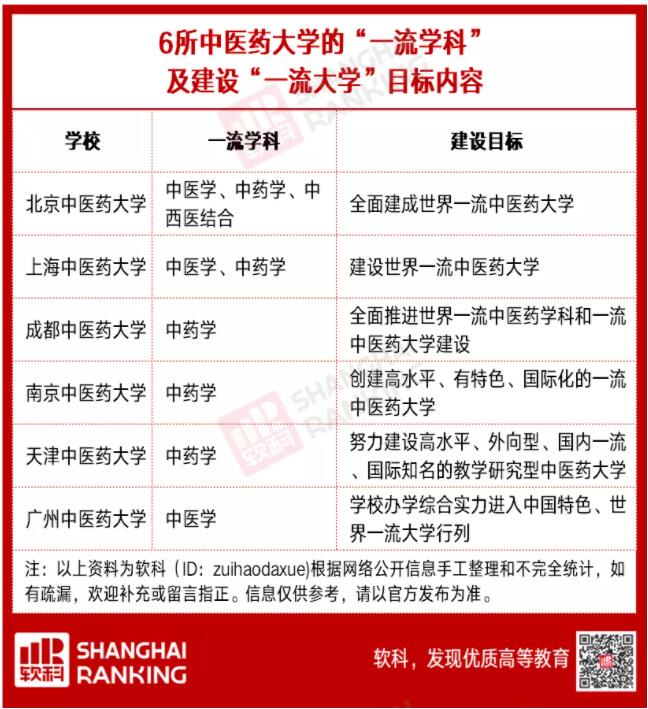 2017年,上海中医药大学、北京中医药大学、天津中医药大学、广州中医药大学、南京中医药大学、成都中医药大学6所中医药院校入选首轮“双一流”一流学科建设名单,建设学科涉及中医学、中西医结合、中药学3个一级学科。在首轮“双一流”建设期间,六所大学各展雄心,立下建设一流大学大学的目标。