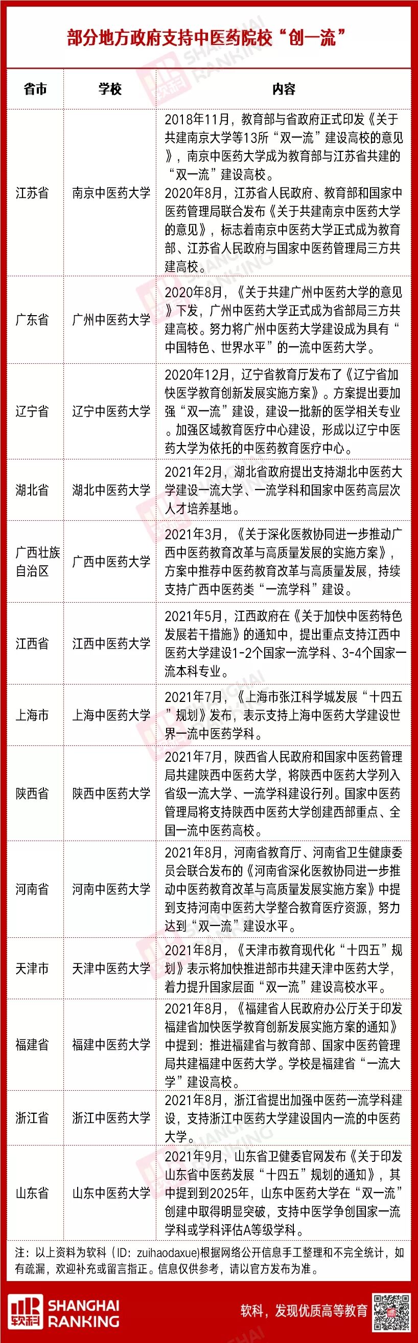 地方高等中医药院校是我国高层次中医药人才培养的主体,地方政府的支持,也是地方中医药院校加速发展的主要引擎。软科(ID:zuihaodaxue)整理了全国各地政府支持当地中医药院校建设“双一流”的信息,如有疏漏,欢迎补充。