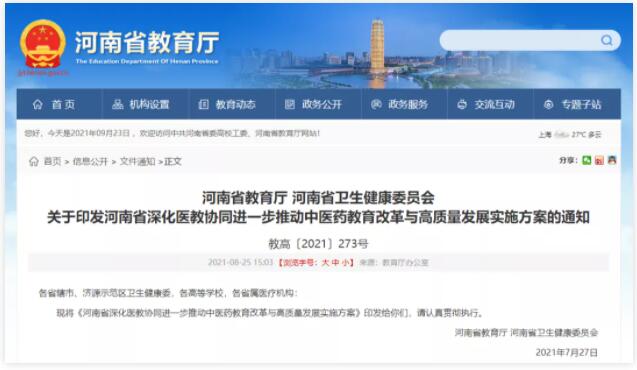 8月25日,河南省印发《河南省深化医教协同进一步推动中医药教育改革与高质量发展实施方案》,其中提出:“将支持河南中医药大学整合教育医疗资源,努力达到“双一流”建设水平;支持河南中医药大学特色骨干学科建设,支持“双一流”建设高校发展中医药学科专业。”此外,河南省还将建设高规格的中医临床教学基地,推动中医学类专业“5+3”一体化人才培养…为打造具有河南特色的中医药人才培养体系,推进河南中医药教育创新发展,河南省政府煞费苦心。