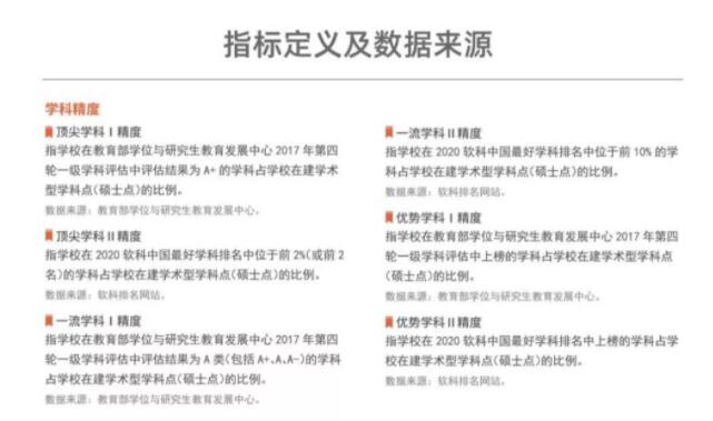 学科精度是2021软科中国大学排名的35个评价维度之一,归属于学科水平模块。其排名对象是被纳入2021软科中国大学排名且有学术型硕士点的高校(不含艺术类高校)。学科精度排名在一定程度上反映了当前我国“高精尖”大学的排列格局。学科精度维度的指标体系和权重如下: