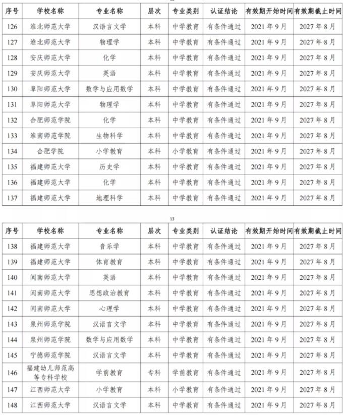 教育部官网发出《教育部办公厅关于公布2021年通过普通高等学校师范类专业认证专业名单的通知》,来自6所高校的6个专业通过第三级专业认证,140所高校的256个专业通过第二级专业认证。