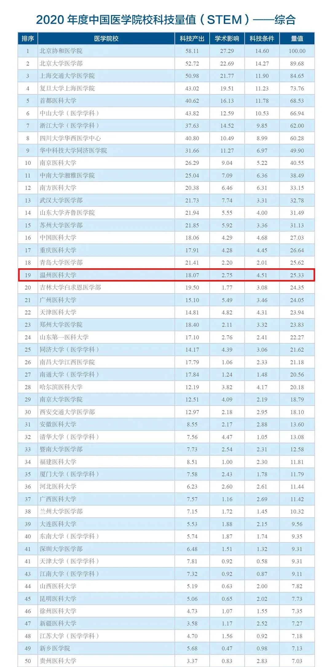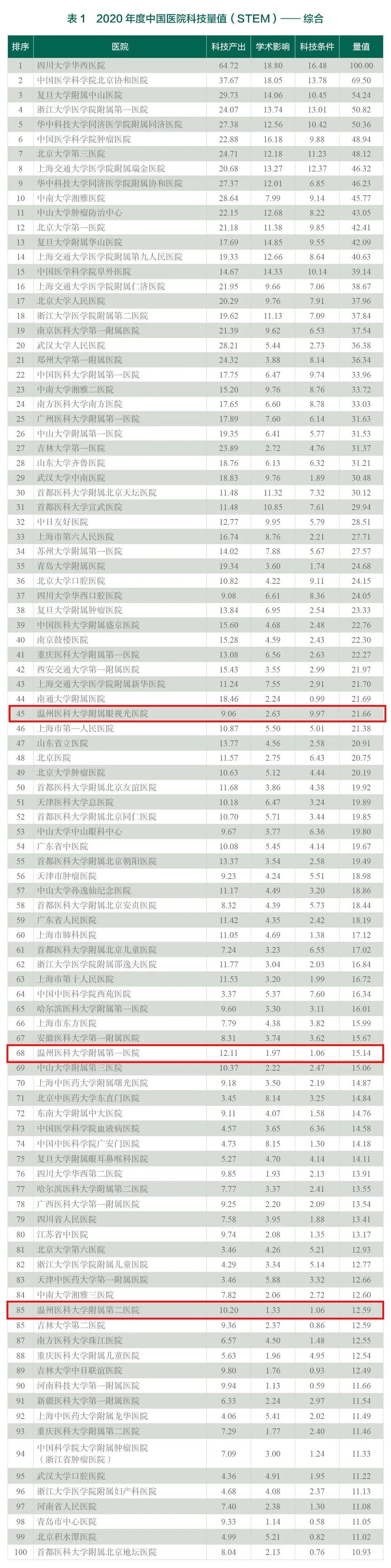 10月31日,中国医学科学院发布2020年度中国医学院校科技量值和中国医院科技量值(STEM)。我校位列中国医学院校综合科技量值第19名,位于委部省共建医科院校第6名。在中国医院综合排行榜中,我校3所附属医院进入综合排名全国百强。其中,附属眼视光医院45位,与去年排名持平,连续3年综合排名全国眼科专科医院第1名;附属第一医院和附属第二医院分别排名68位和85位,较去年均进步了12名。