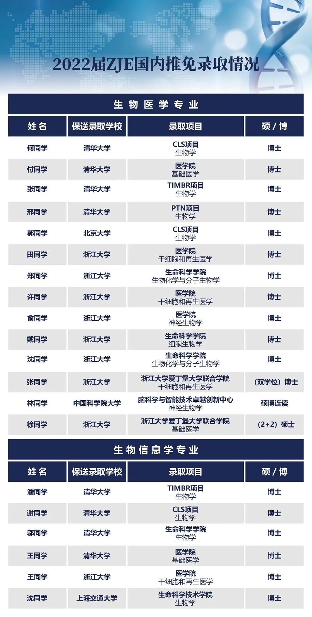 近期,国内各大高校公布推荐免试研究生拟录取名单,浙江大学爱丁堡大学联合学院(ZJE)获得保送资格的2022届同学们取得了傲人的成绩。我院推荐的20名同学全部被国内顶尖高校免试录取。录取学校包括清华大学、北京大学、浙江大学、中国科学院及上海交通大学。其中19人直接录取为博士,1人为浙大思政“2+2”硕士,直博录取率高达95%。