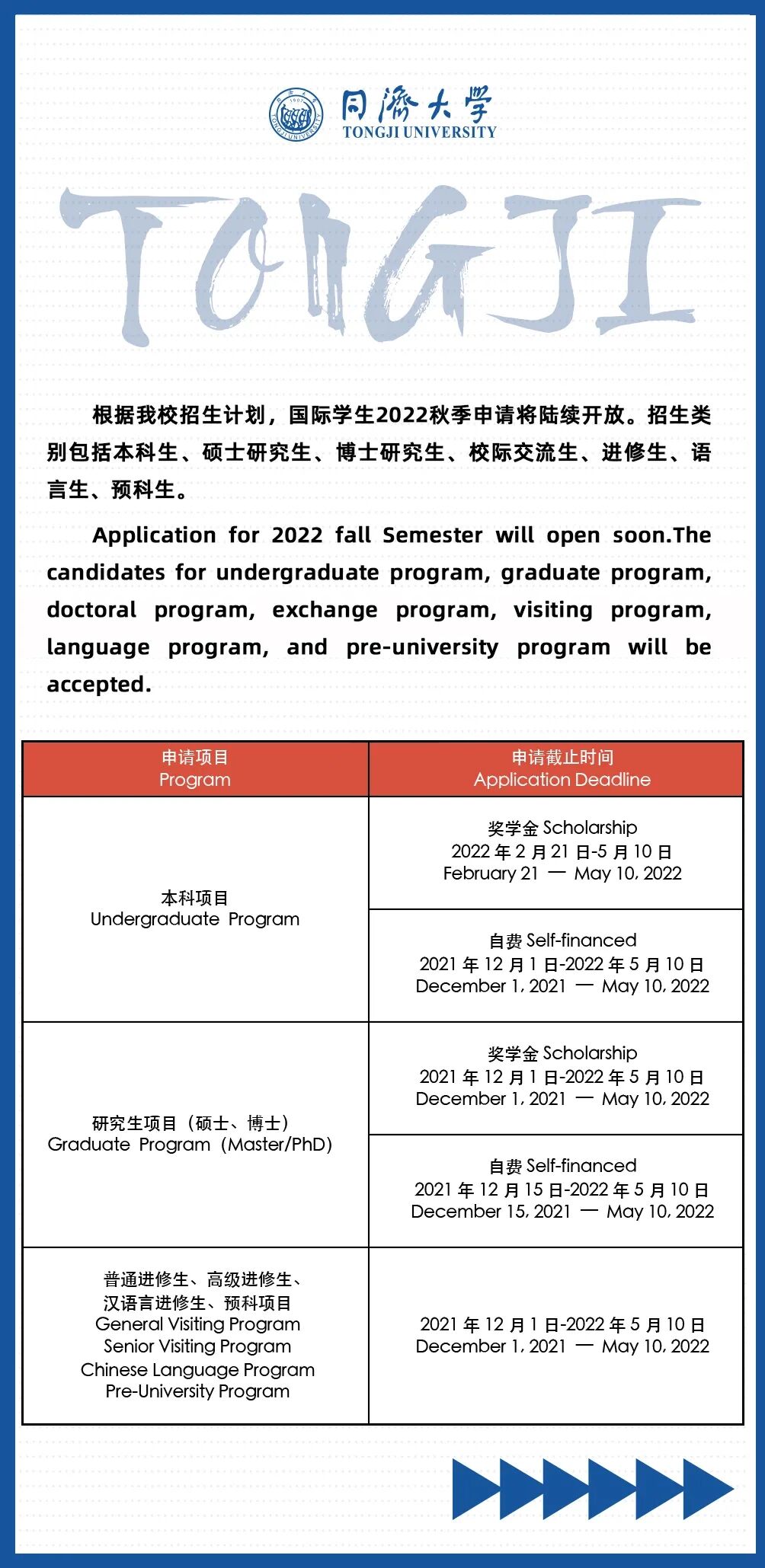 同济大学2022年国际学生申请时间表及本科项目在线宣讲活动安排