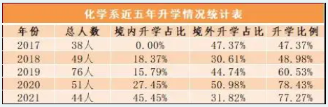 近五年,有162位本科毕业生选择在化学领域继续深造,他们通过推免、考研、申请直博等方式进入境内外知名学府学习。受新冠疫情影响,近两年境外升学占比有所下降,境内升学比例升高。