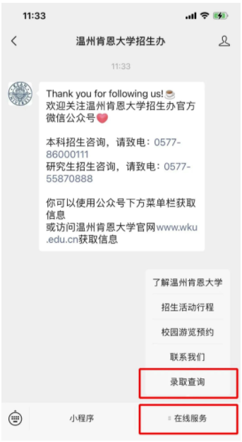 “温州肯恩大学本科招生”小程序——“录取查询”