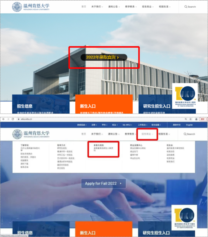 温州肯恩大学2022年浙江三位一体提前批已录取完毕,录取查询方式如下