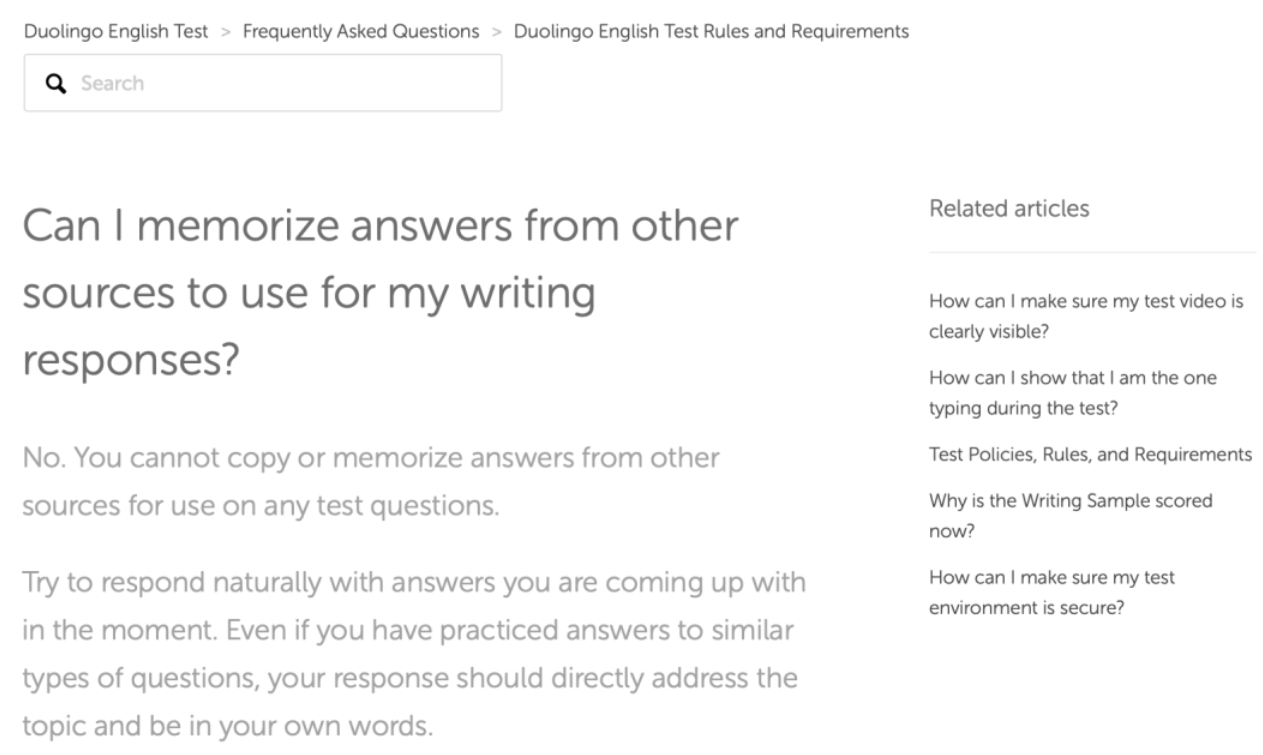 为了维护真实健康的学术环境,多邻国英语测试与海外高校的学术要求保持一致,严格保障测试成绩的完整性。一旦考生在测试过程中被检测到使用和外部内容高度重合的答案,即被判为作弊行为,且不能获得该场考试的认证成绩,请大家务必予以高度重视。