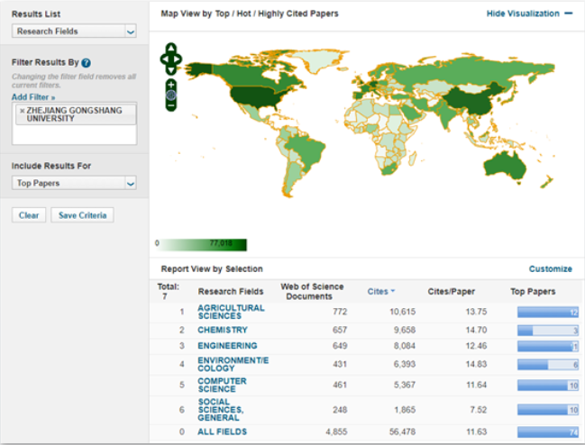 截止目前,浙江工商大学ESI全球前1%学科数达到6个,分别是农业科学、工程科学、计算机科学、环境/生态学、化学、一般社会科学。