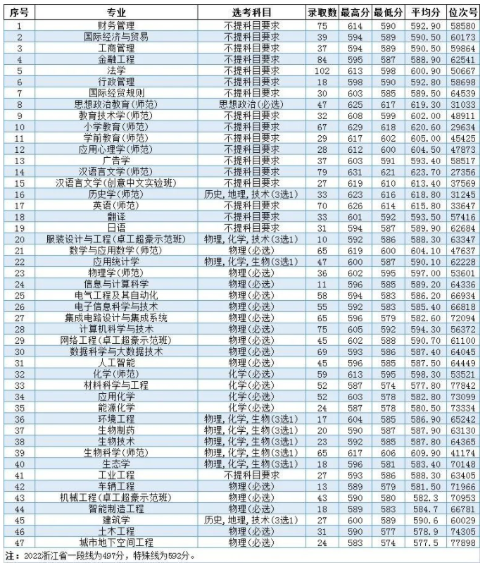 2022年温州大学浙江分专业录取分数线