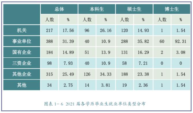 事业单位(31.39%)是吸纳我校 2021 届毕业生就业的主渠道。分学历看,不同学历层次的毕业生具体流向的单位类型存在差异,其中本科毕业生流向机关(26.16%)、国有企业(13.90%)、事业单位(10.90%),硕士毕业生和博士毕业生则主要流向事业单位,比例分别为 35.82%、92.31%。