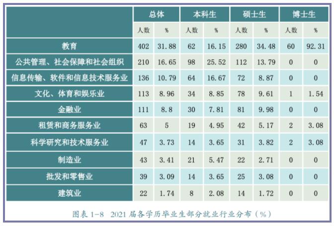 教育业(31.88%),公共管理、社会保障和社会组织(16.65%),信息传输、软件和信息技术服务业(10.79%)是 2021 届毕业生流向人数最多的前三个行业。