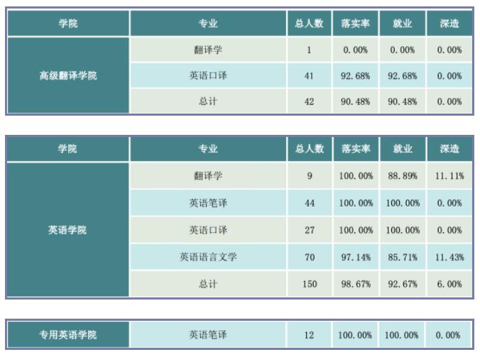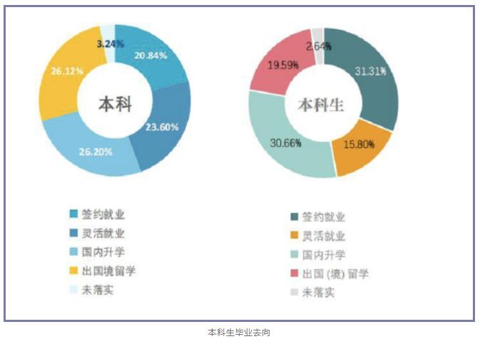 2021届本科毕业生1399人,本科生去向落实率为97.36%。其中,直接就业率为47.11%,国内升学429人,出国(境)留学274人,分别占本科毕业生总人数30.66% 和19.59%,继续深造率为50.25%。