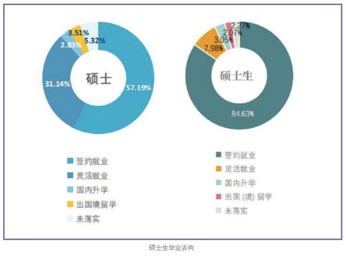 2021届硕士毕业生1015人,硕士生去向落实率为97.73%。其中,直接就业率为92.61%;国内升学31人,出国(境)留学21人,分别占硕士毕业生总人数3.05%和2.07%,继续深造率为5.12%;