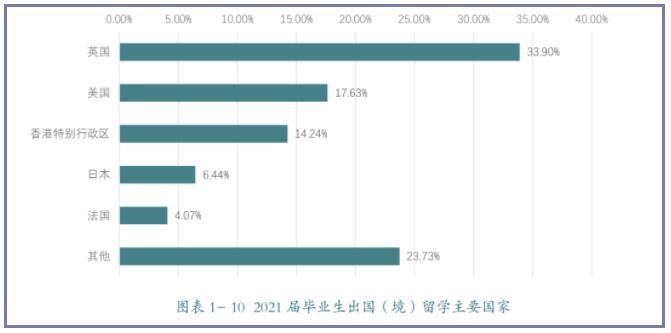 2021 届毕业生出国、出境深造人数295 人,占毕业生总人数的11.85%,其中本科毕业生274 人,硕士毕业生21 人。2021届毕业生出国、出境深造的国家(地区)主要分布在英国(100人)、美国(52人)、香港特别行政区(42人)等国家(地区)。