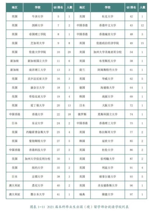 根据 2021年全球高等教育研究机构QS (QuacquarelliSymonds) 发布的世界大学最新排名(2021年6月),北外共有165 个本科毕业生赴世界排名前100的国(境)外高校留学深造,占出国(境)本科毕业生总人数的60.22%。