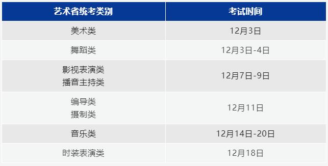 我省艺术类省统考将分类别于今年12月陆续举行,具体时间安排如下: