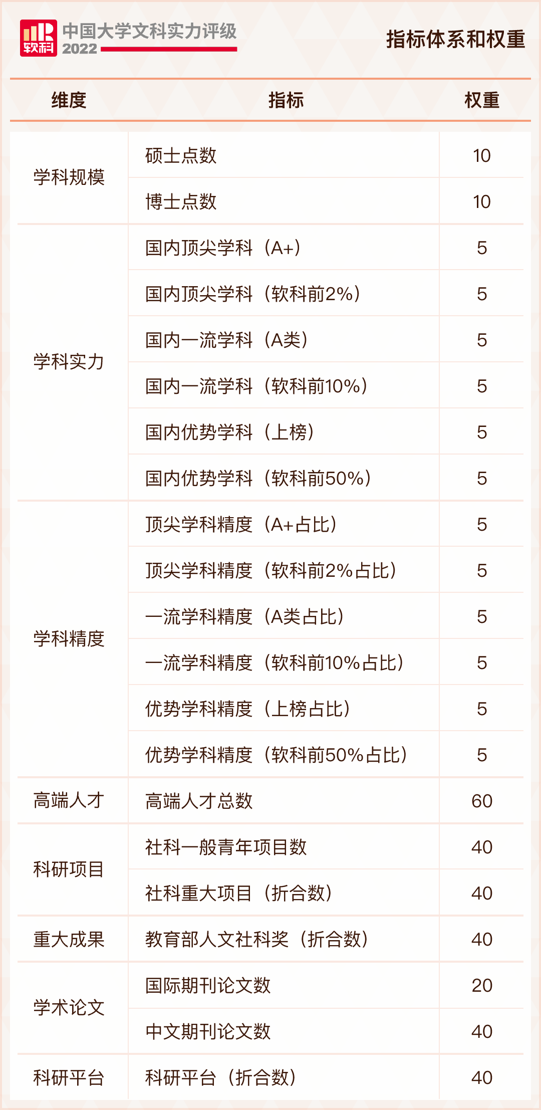 中国大学文科实力评级包含学科规模、学科实力、学科精度、高端人才、科研项目、重大成果、学术论文和科研平台8个维度。相比2020年,今年的文科实力排名新增高端人才和科研平台2个评价维度。