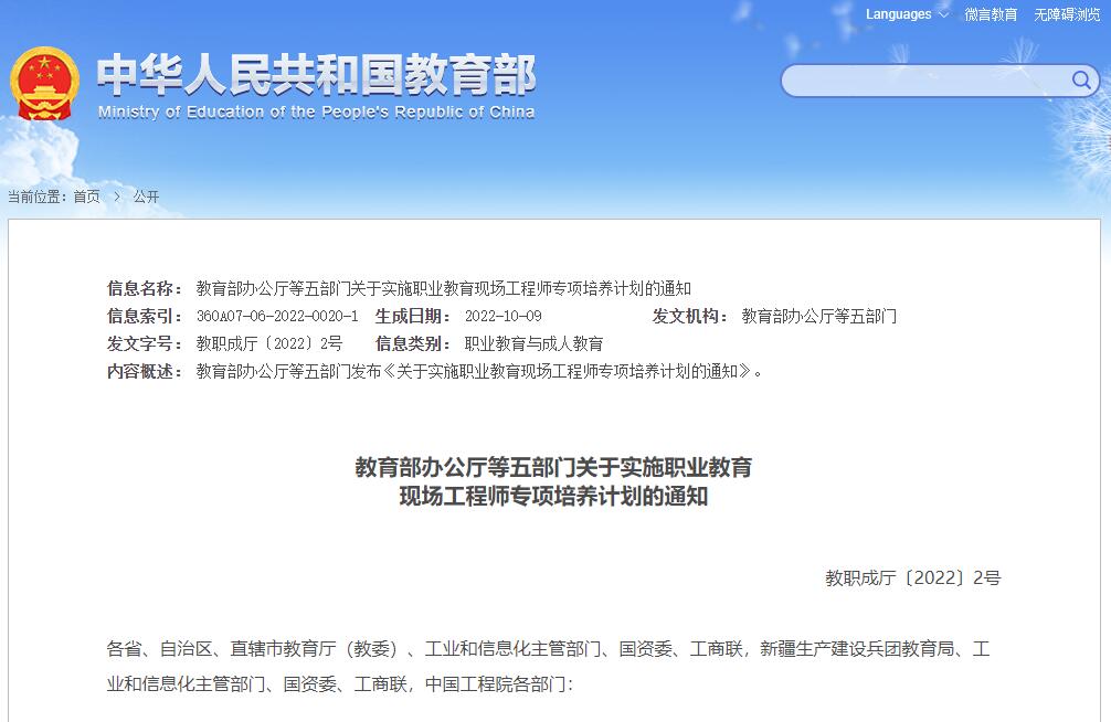 教育部:启动实施“职业教育现场工程师专项培养计划”,培养不少于20万名现场工程师
