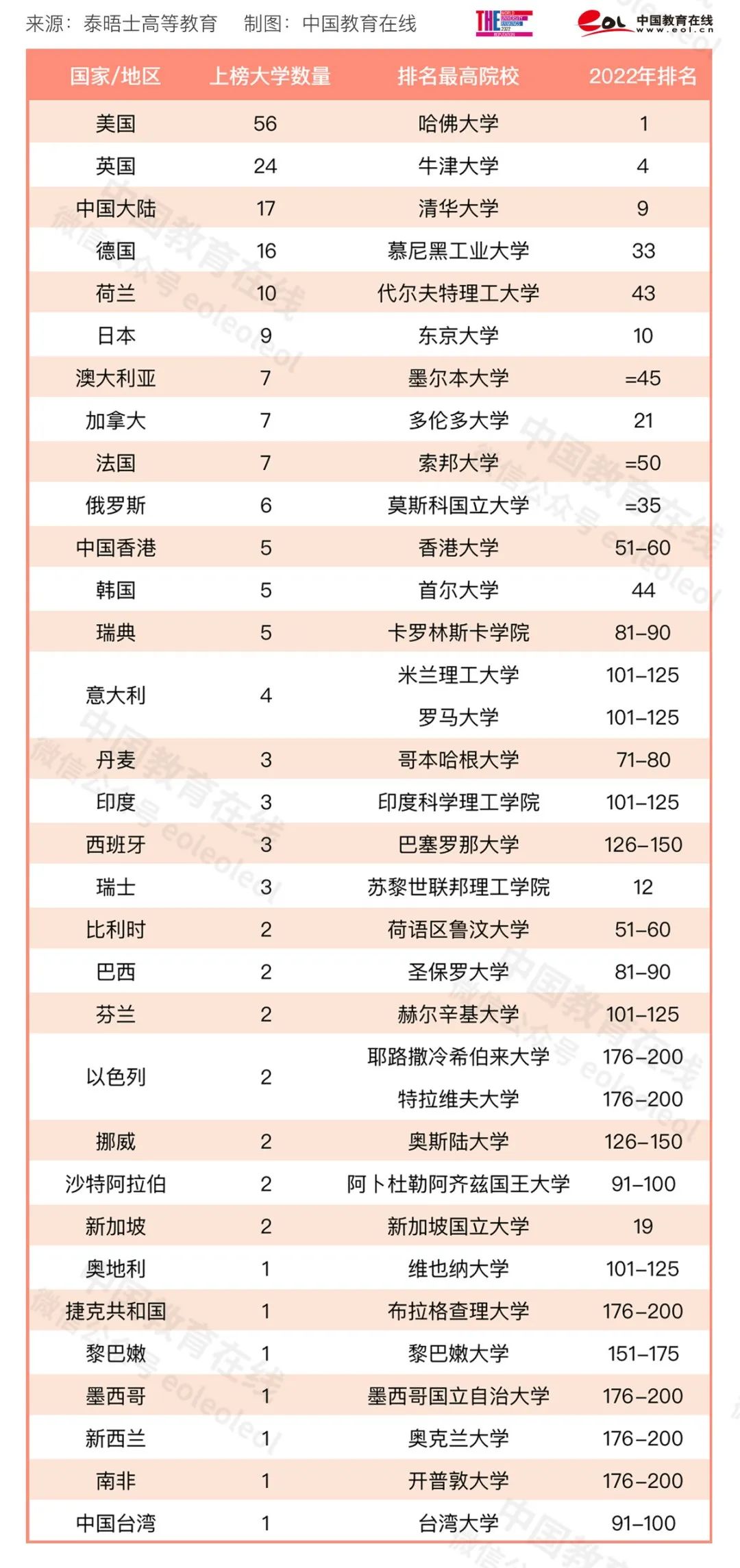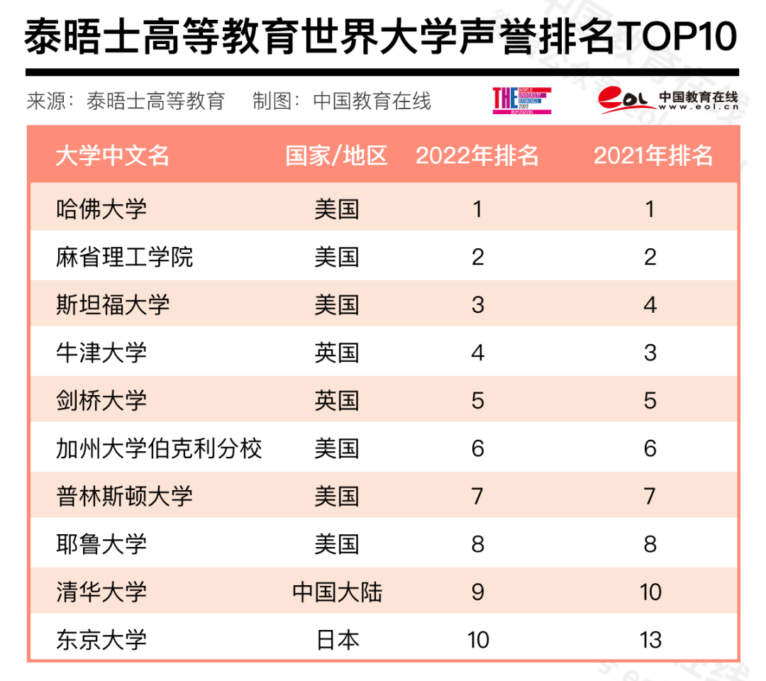 近日,泰晤士高等教育公布了2022年世界大学声誉排名结果,此排名是由高等教育界评选出的世界前200所最负盛名的大学。