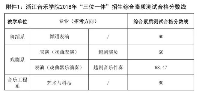 根据《2018年浙江音乐学院“三位一体”综合评价招生章程》规定的综合素质测试合格入围分数线划定原则,我院划定2018年“三位一体”招生综合素质测试合格入围考生名单。现将综合素质测试合格分数线及合格入围考生名单予以公示,公示期7天。