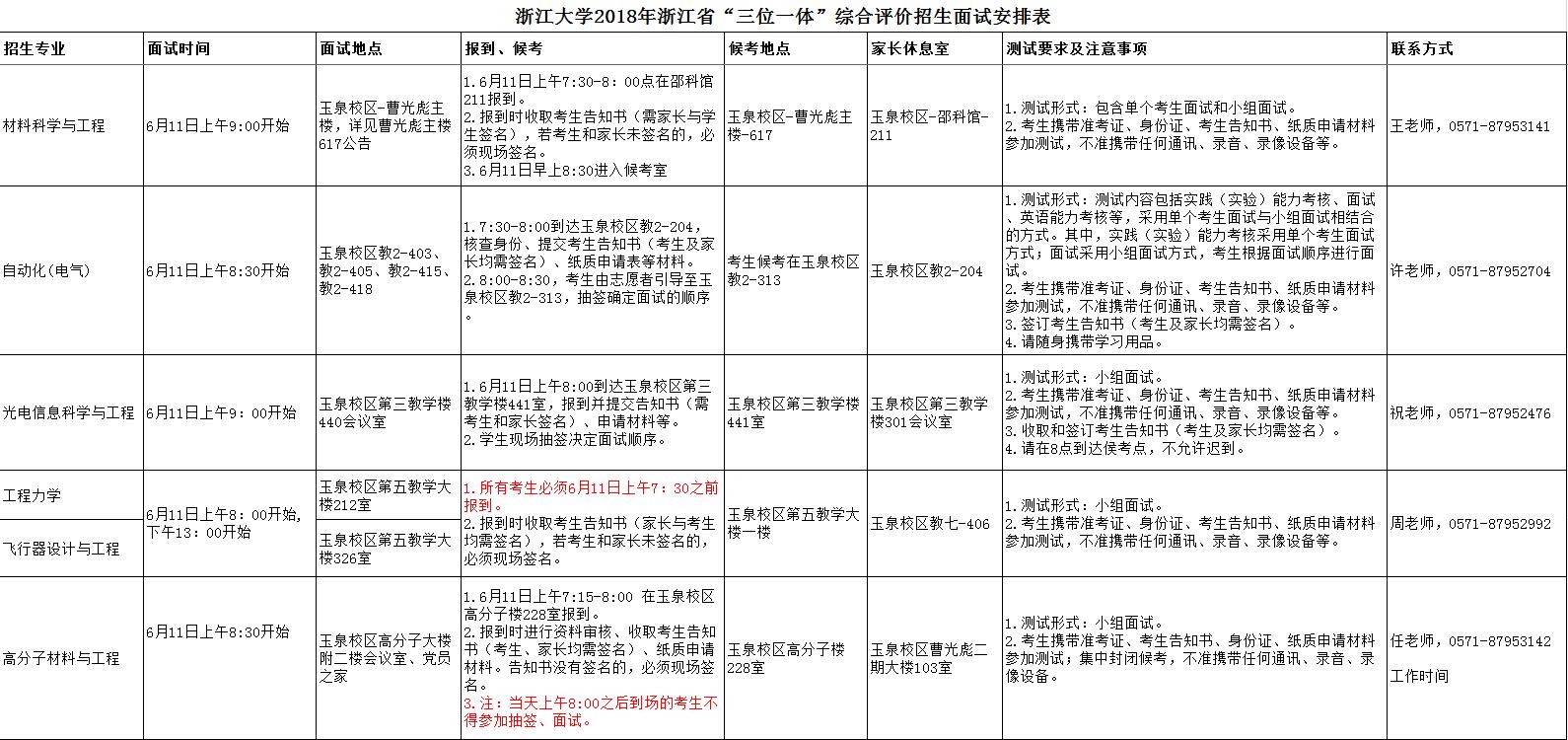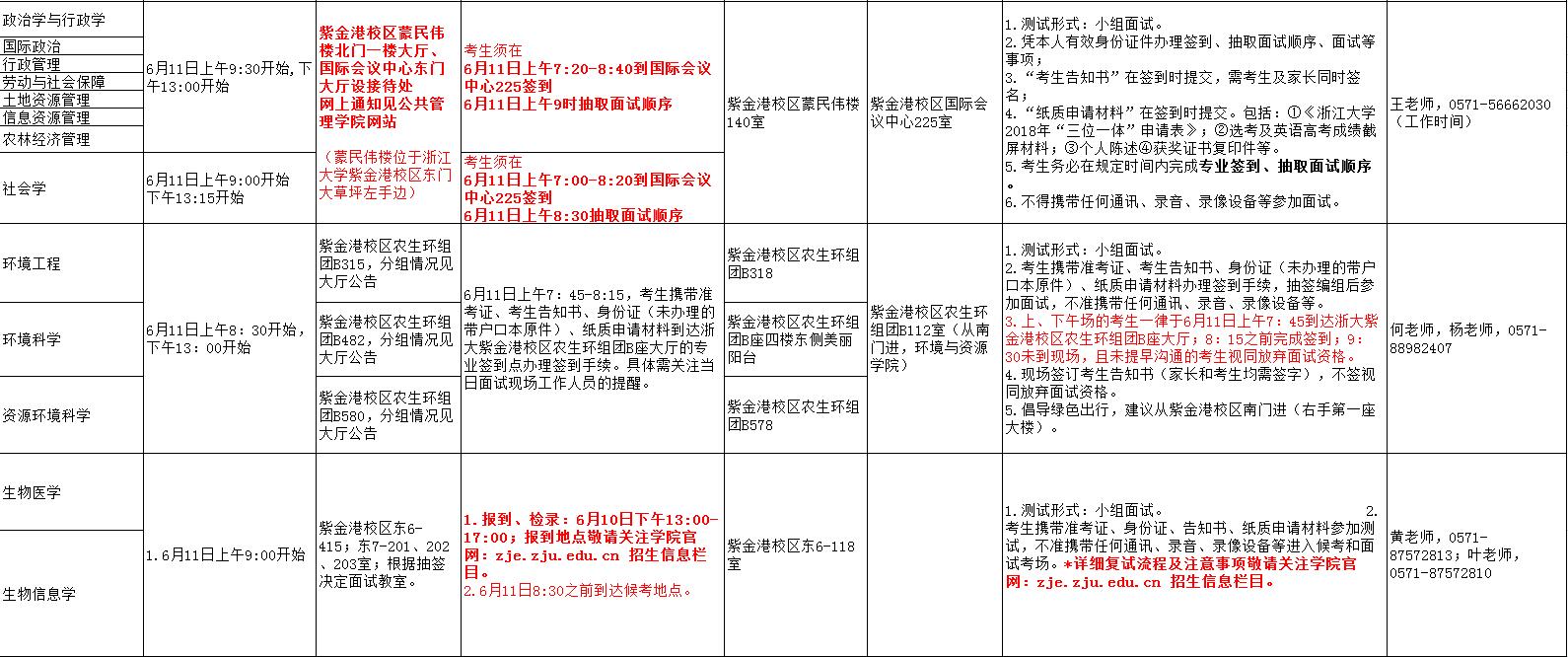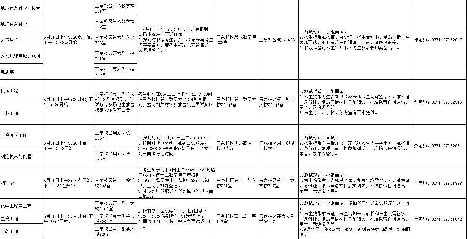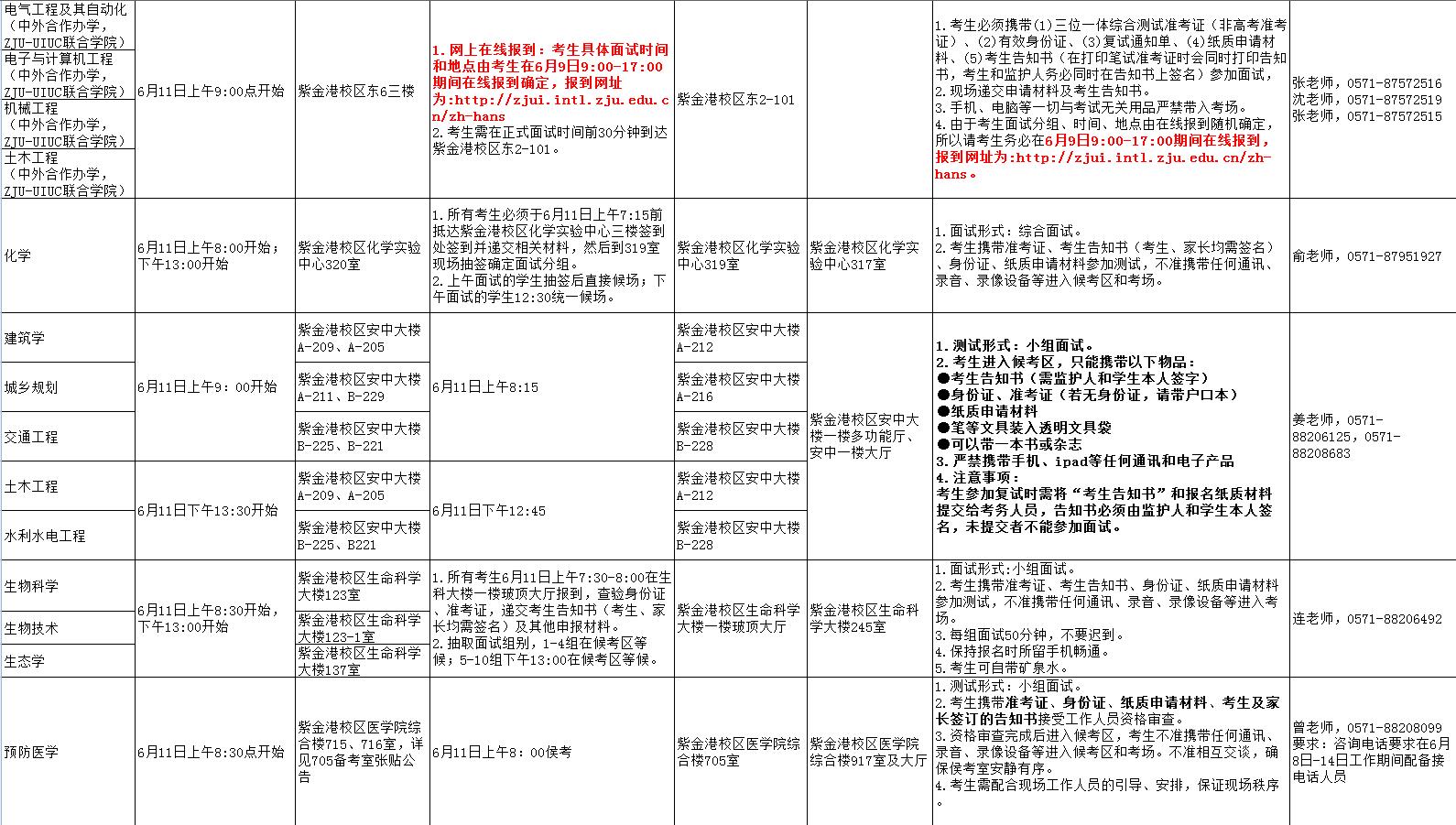 2.面试地点:按专业进行面试。各专业面试地点不同,分布在浙江大学紫金港校区、玉泉校区、西溪校区(校区详细地址:紫金港校区--杭州市西湖区余杭塘路866号,玉泉校区--杭州市西湖区浙大路38号,西溪校区--杭州市西湖区天目山路148号),请考生注意面试地点分布,按各专业面试要求准时参加面试。各专业具体面试时间、地点及要求详见下表。