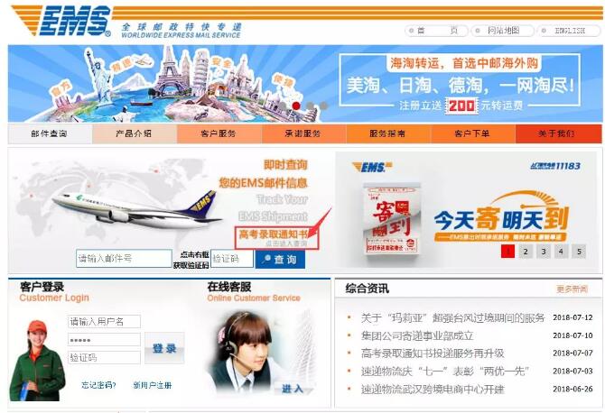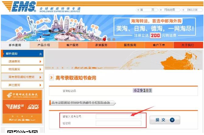 进入EMS官方网站http://www.ems.com.cn/,点击“高考录取通知书”