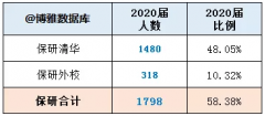清华大学2020届保研共计1798人。 保内1480人。 保外318人。 保研率58.38%。 清华大学2020届本科生保研本校共计1444人。其中硕士722人,直博生722人。 2020届就业情况 2020年清华大学本科毕业生