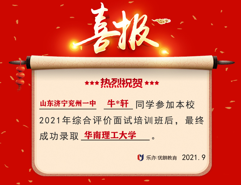 2021喜讯:山东济宁兖州一中牛*轩同学成功录取华南理工大学