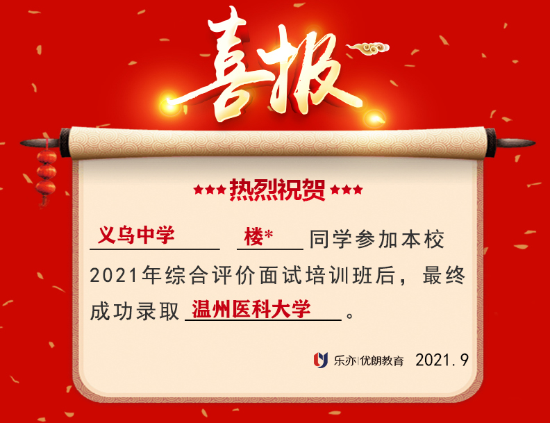 2021喜讯:义乌中学楼*同学成功录取温州医科大学