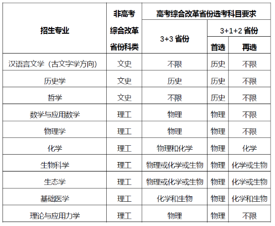 (一)强基计划招生专业包括汉语言文学(古文字学方向)、历史学、哲学、数学与应用数学、物理学、化学、生物科学、生态学、基础医学、理论与应用力学。招生科类和高考改革省份选考科目要求如下:
