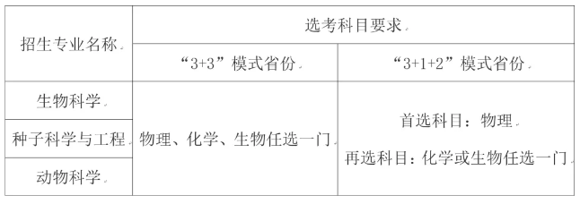2021年中国农业大学强基计划招收专业为:生物科学、种子科学与工程、动物科学,考生可填报一至三个专业志愿,并填报是否服从专业调剂。非高考综合改革省份招收理工类考生;高考综合改革省份选考科目需满足以下要求: