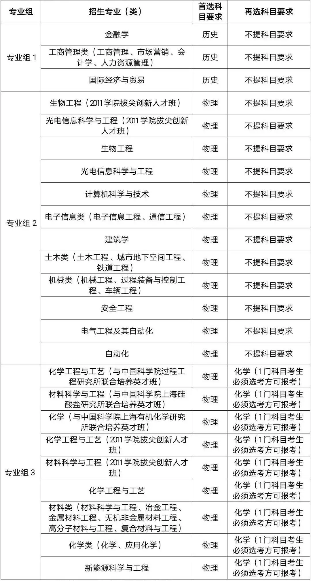 学校将招生专业(类)根据选考科目要求分为三组,具体专业组别、专业(类)名称、选考科目要求见下表。