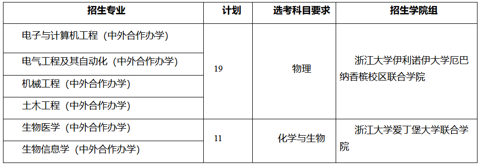 注1:浙江大学伊利诺伊大学厄巴纳香槟校区联合学院招生的4个专业共用19个招生计划,浙江大学爱丁堡大学联合学院招生的2个专业共用11个招生计划。