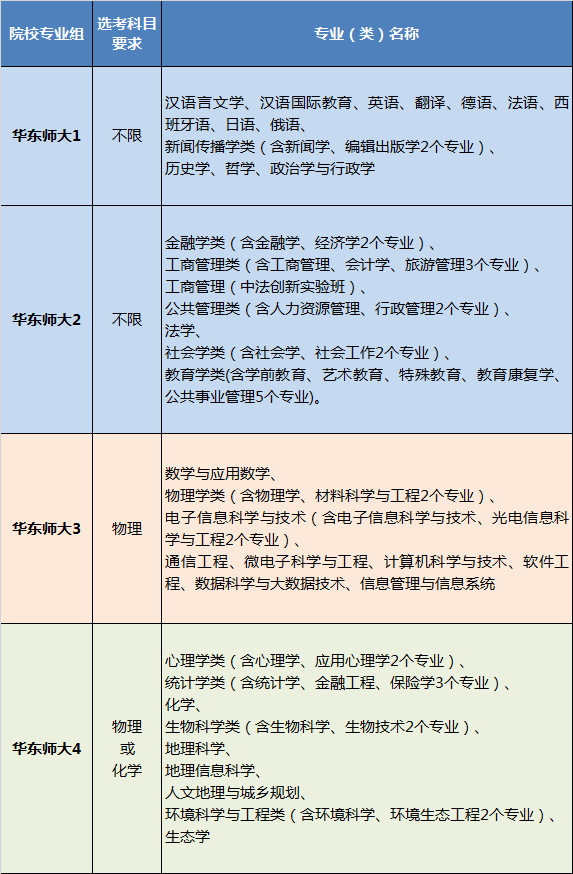 附表:华东师范大学2021年综合评价批次招生院校专业组及科目要求