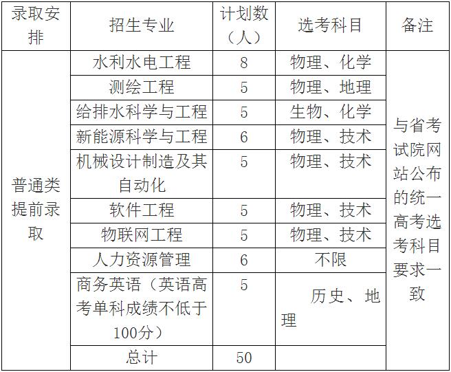 招生总计划数为50名,均为普通类提前录取。具体招生专业、选考科目、计划数如下表: