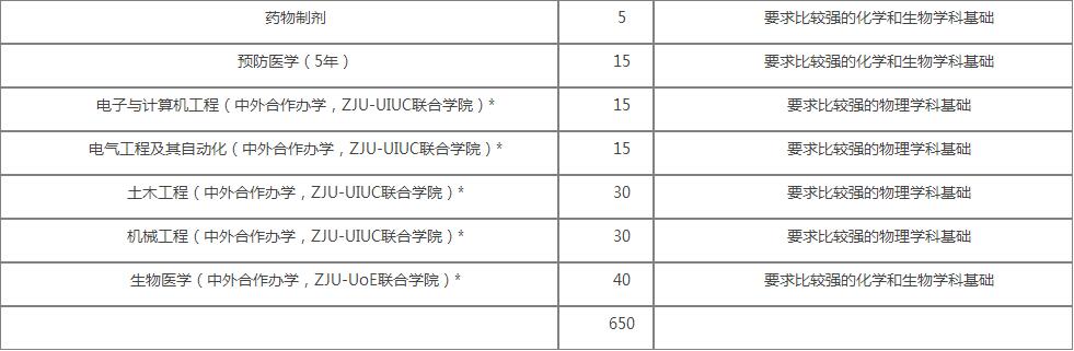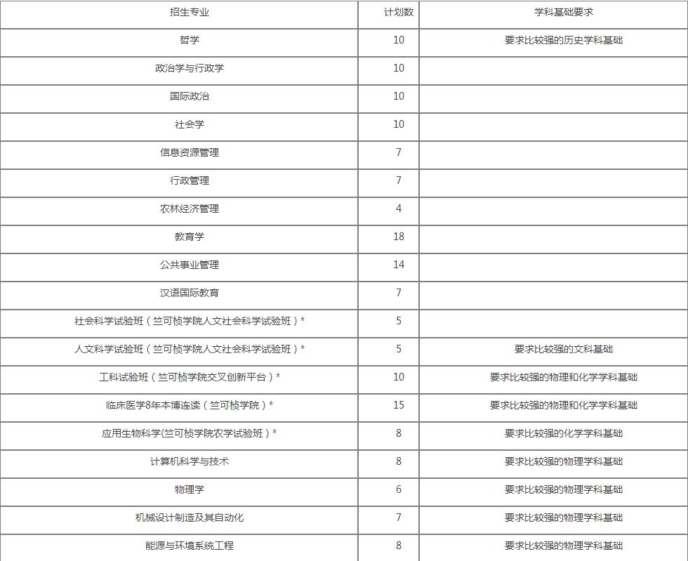 *注:1.社会科学试验班(竺可桢学院人文社会科学试验班)和人文科学试验班(竺可桢学院人文社会科学试验班)按社会科学试验班和人文科学试验班招生,进校后进入竺可桢学院人文社会科学试验班学习;工科试验班(竺可桢学院交叉创新平台)进校后进入竺可桢学院工科混合班学习;临床医学8年本博连读直接进入竺可桢学院巴德年班学习;应用生物科学(竺可桢学院农学试验班)按应用生物科学招生,进校后进入竺可桢学院农学试验班学习。