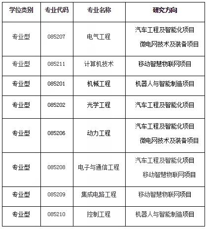 2.招生专业、专业代码及研究方向:见表一。请务必填报你选择的项目(研究方向),我院将按下列项目进行录取:机器人与智能制造项目、汽车工程及智能化项目、微电网技术及装备项目、移动智慧物联网项目。