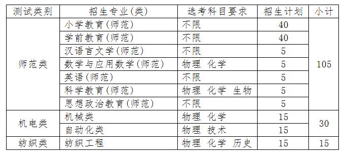 2.考生只能在测试类别中(师范类、机电类、纺织类)选择其中一类报考,不得兼报。学校按各测试类别分别组织综合素质测试,综合素质测试成绩在同一测试类别内的所有专业(类)均有效。