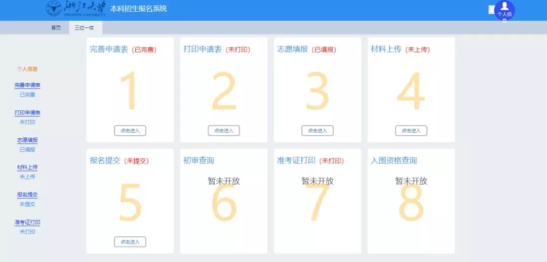 填写个人信息→完善申请表→打印申请表→志愿填报→材料上传→报名提交→准考证打印